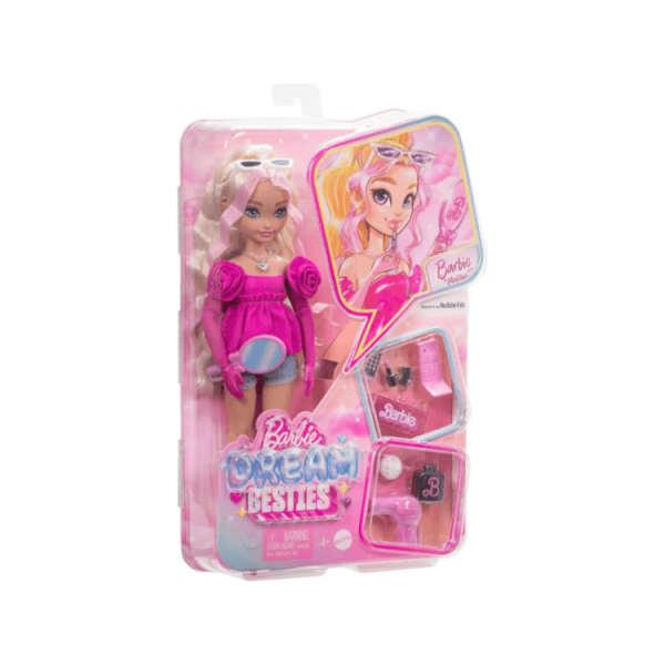 בובת ברבי Barbie Dream Besties Malibu Doll – בובת ברבי בסגנון "מאליבו", חלק מקולקציית Dream Besties. הבובה מגיעה עם אקססוריז אופנתיים, כולל תיק, שפתון, טלפון נייד, ומסרק לשיער – אידיאלית למשחקי דמיון ויצירת סיפור.
