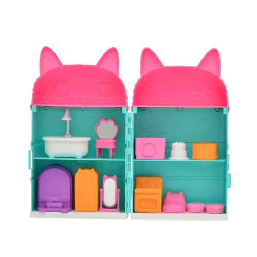 הסט כולל בית בובות בעיצוב ייחודי עם גג חתולי ורוד, חדרים צבעוניים, דמות גבי, דמות חתול מתוק ומגוון רהיטים ואביזרים קטנים.