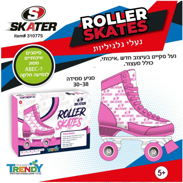 גלגיליות מבית SKATER גלישה חלקה ובטוחה עם מיסבים איכותיים מסוג ABEC-7 מעצור קדמי עמיד במיוחד בסיס חזק מאושר מכון התקנים מתאים גיל 5+