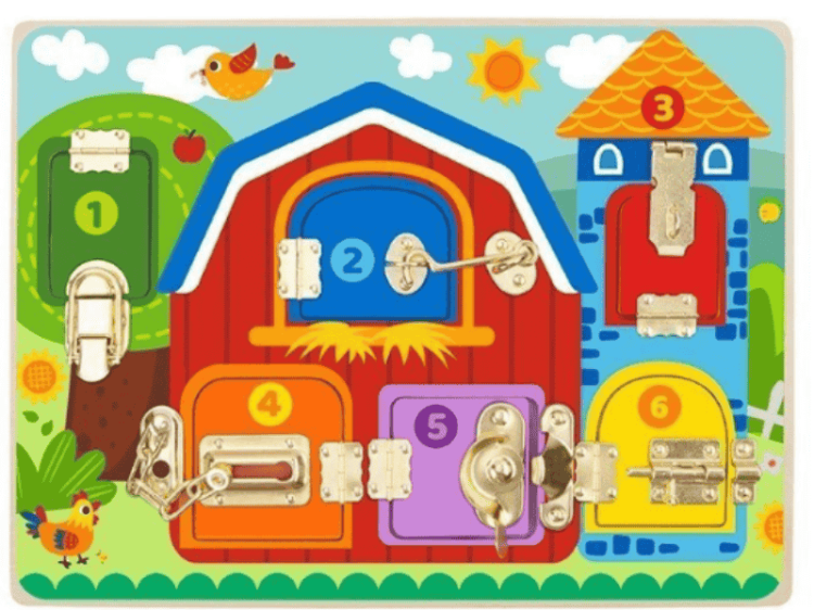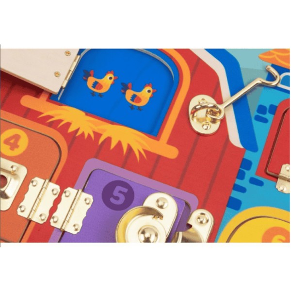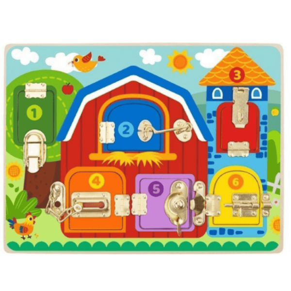 לוח פעילות מעץ הכולל שישה חלונות עם מנעולים שונים, המאפשרים לילדים ללמוד כיצד לפתוח ולסגור מנעולים מסוגים שונים. מאחורי כל דלת מסתתרת תמונה של חיות חווה, מה שמעודד את הילדים ללמוד על בעלי חיים שונים.