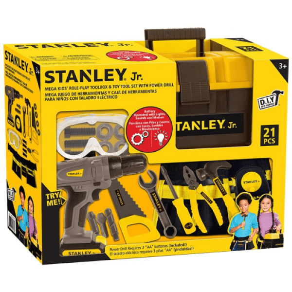 סט כלים סטנלי ג'וניור מגה עם מקדחה מופעלת באמצעות סוללה וחגורת כלים ערכת משחק תפקידים לילדים של STANLEY Jr מכילה אוסף של כלי המשחק הטובים ביותר להעמיד פנים שילדכם יזדקק להם. הסט כולל: ארגז כלים, חגורת כלים, משקפי בטיחות, סרט מדידה, מקדחה המופעלת באמצעות סוללה עם שלושה ביטים להחלפה, ארבעה ברגים, ארבעה ברגים , מסור, פטיש, מברג, פלייר ומפתח ברגים. תן לדמיון של ילדך להשתולל עם סט הכלים הנהדר הזה. עודדו יצירתיות באמצעות משחק העמדת פנים והרבה כיף! כל אחד מהכלים האיכותיים והחסונים שלנו עשויים מחומרים עמידים לשימוש ארוך טווח. עוצב ומותאם לידיים של ילדים. אורות, צלילים ותנועה מציאותיים. מיוצר במומחיות תוך שימוש במבנה פלסטיק עמיד. סט כלי צעצוע 21 חלקים, סוללות כלולות. גיל מומלץ: 3+