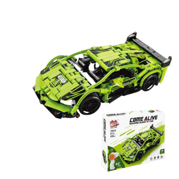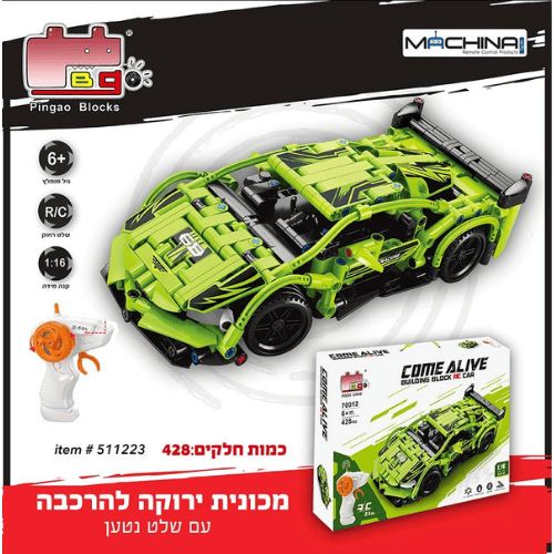 מכונית ספורט ירוקה בעיצוב מרהיב להרכבה עצמית, עם שלט רחוק שמכניס אתכם לעולם של מהירות, יצירתיות וכיף אינסופי!