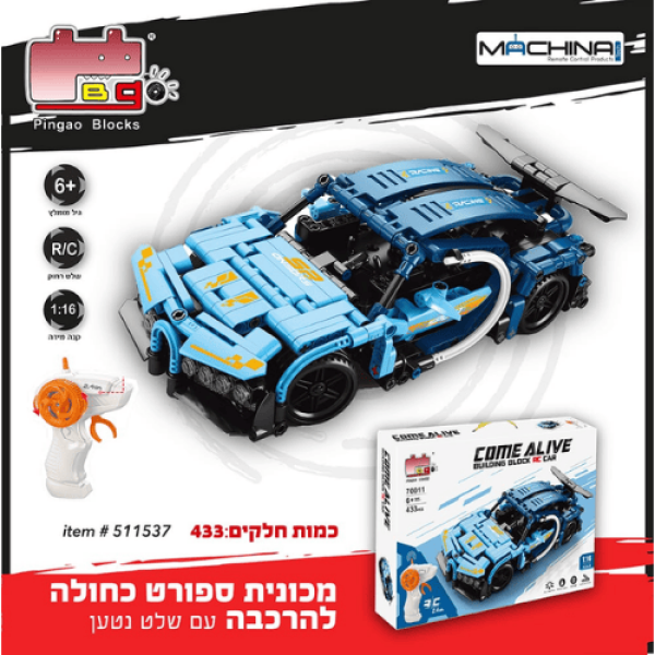 מכונית ספורט כחולה להרכבה עם שלט נטען חוויית בנייה מרתקת בשילוב שליטה מרחוק! עם 433 חלקים להרכבה, עיצוב חדשני, וקנה מידה 1:16 מתנה מושלמת לילדים שאוהבים להרכיב ולהתחרות 🚗✨
