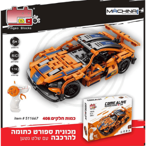 מכונית ספורט כתומה להרכבה עם שלט נטען שילוב מנצח בין בנייה חווייתית ושליטה מרחוק! כוללת 408 חלקים בקנה מידה 1:16 ומתאימה לגילאי 6 ומעלה.