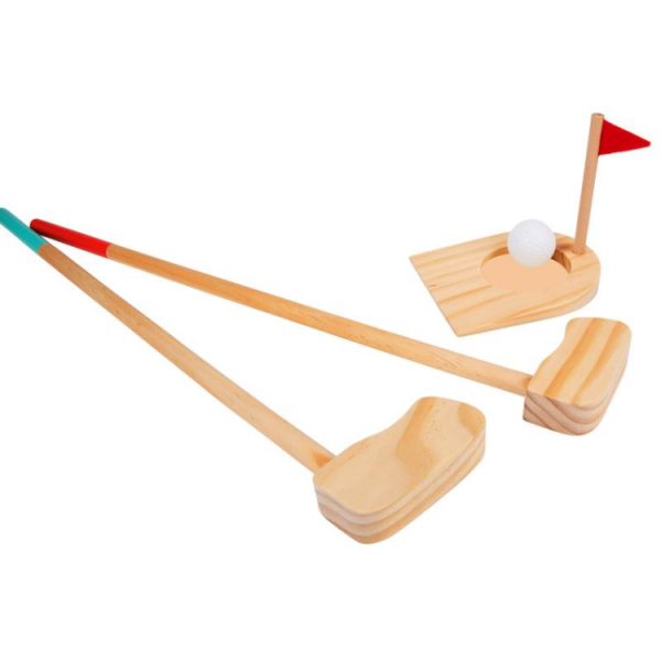 הוא סט עץ בן 12 חלקים המאפשר לך ליצור משחק מיני גולף משלך בגינה או בבית. סט גולף זה מגיע עם רמפות כדי להפוך את ההגעה לחור קצת יותר מסובכת ו-3 חישוקי קשת שנעשים קטנים יותר וקשים יותר לניווט. זהו סט גולף מטורף יציב ועשוי היטב והוא מגיע עם תיק בד כדי לשמור על הכל בטוח ומסודר. הסט כולל 2 x מקלות גולף 2 x כדורים 3 x רמפות 3 קשתות קשת בענן חור ודגל גודל תיק 59 על 10 ס"מ רוחב חומר: צבע עץ בטוח לילדים. לגילאי 3+ אנחנו אוהבים את זה כי: "אוהבים את כל המכשולים". משקל: 2.50 ק"ג