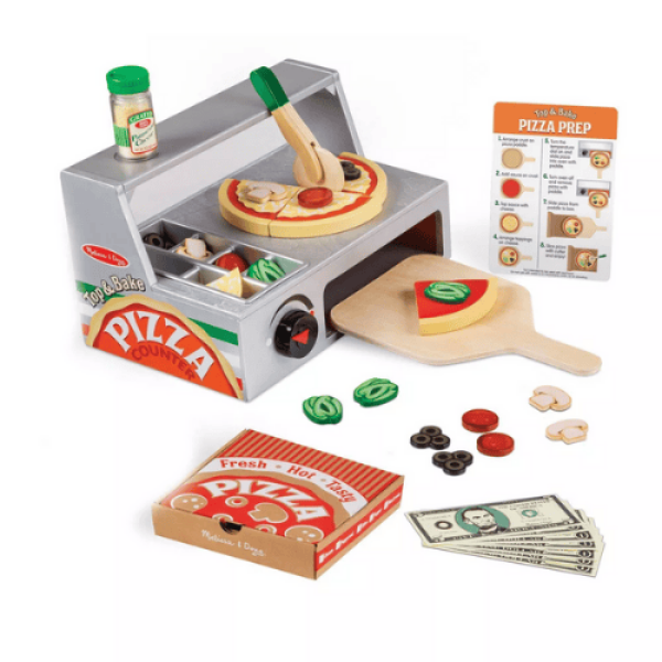 עם סט הפיצה המעץ של Melissa & Doug הילדים יוכלו להכין פיצות ממש כמו במסעדה לבחור תוספות לפי כרטיס ההזמנה, לאפות בתנור העץ, להוציא עם המרית ולהגיש ללקוחות בקופסת הפיצה המצורפת.