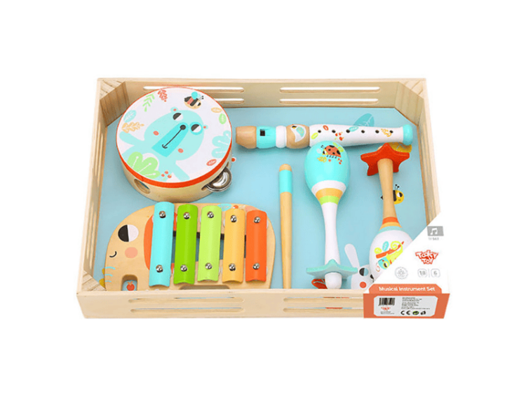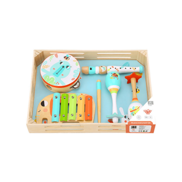 סט זה כולל שישה כלי נגינה מעץ צבעוניים, המותאמים במיוחד לידיים קטנות, ומאפשרים לילדים להכיר את עולם המוזיקה בצורה חווייתית ומהנה. הכלים עשויים מעץ איכותי וצבועים בצבעים לא רעילים, המבטיחים עמידות ובטיחות.