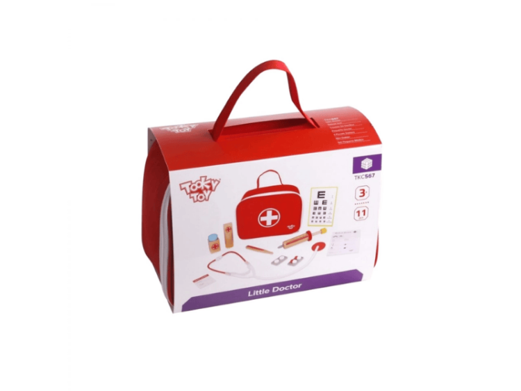 ערכת רופא לילדים מבית Tooky Toy כולל ציוד רפואי מעץ, תרמיל אחסון ומסמכים חינוכיים. המוצר מיועד לפיתוח דמיון ומשחק תפקידים, מתאים לילדים מגיל 3 ומעלה.