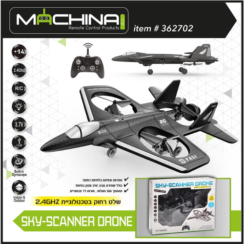 רחפן נטען בעיצוב מטוס קרב MACHINA SKY SCENNER DRONE טיסה יציבה. גוף קל, עמיד וגמיש. לטיסן ג’ירוסקופ פנימי המאפשר שליטה קלה. כולל סוללה נטענת ומטען USB מהיר. יתרון משמעותי של מטוס קרב זה הוא החומר דמוי קלקר גמיש ממנו הוא עשוי וחרטום סיליקון גמיש נגד התנגשויות, מה שהופך אותו לקל משקל וכמעט בלתי שביר בעל 3 מדחפים שמאפשרים לו להתרומם ולנחות כמו רחפן ולנוע במרחב כמו טיסן, מערכת שמירת גובה, אפשרות לביצוע פעלולים כמו היפוך 360 מעלות בלחיצת כפתור אורות לד צבעוניים לזיהוי בעת שימוש בשעות הלילה ובנוסף, רחפן בעיצוב מטוס קרב זה הוא אחד הרחפנים היפים והמיוחדים ביותר שניתן למצוא בדיקה מעמיקה של רחפן SKY SCANNER DRONE מתגלה רחפן מקצועי ומיוחד אשר עשוי מחומר מוקצף ועמיד במיוחד, 3 רוטרים (מדחפים) לביצועי טיסה מושלמים, פניות חדות ופעלולים, מערכת ייצוב ושמירת גובה באמצעות ג'ירוסקופ מובנה, המראה ונחיתה בלחיצת כפתור, תכונות רחפן מטוס הקרב • אפליקציה ייעודית לאייפון / אנדרואיד • אפליקציה ייעודית לשליטה ובקרה (הורדה בחינם) • מאפשר המראה / נחיתה בלחיצת כפתור • היפוך 360 מעלות בלחיצת כפתור • ייצוב גובה וקיזוז • תאורת לד • תשדורת WIFI לשידור הצילום למכשיר הסמארטפון שלכם • מאפשר צילום ושמירה של ווידאו ותמונות ישירות לסמארטפון שלכם • כולל 4 רוטרים נוספים מתנה • כולל שלט אלחוטי מלא או אפשרות לחיבור סמארטפון בתור שלט (סמארטפון לא כלול) רחפן עם מצלמה HD זה מופעל באמצעות סוללה נטענת (כלולה) כבל טעינה בחיבור USB (כלול) 3 סוללות AA (לא כלולות) בעבור השלט רחוק מתאים לגיל 14 + רחפן נטען בעיצוב מטוס קרב MACHINA SKY SCENNER DRONE רחפן בעיצוב מטוס קרב מטוס קרב כולל גיירו סקופ פנימי המאפשר שליטה קלה טיסה יציבה , להמראה ונחיתה קלה