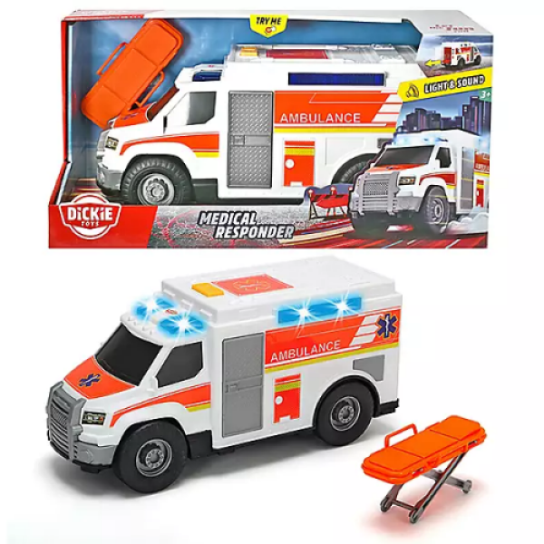 אמבולנס 30 ס"מ כולל אלונקה, אפקטים אור וקול, דלת אחורית נפתחת, כולל סוללות, רכב צעצוע לילדים מגיל 3 ומעלה Dickie Toys Medical Responder – רכב שירותי החירום האולטימטיבי! גלגלים מסתובבים, אמבולנס צעצוע זה יכול להיות במקום תוך זמן קצר כדי לספק עזרה ראשונה לפציעות ומקרי חירום רפואיים. אפקטים קוליים מציאותיים כל הילדים מזהים צליל של צפירת אמבולנס. ממש כמו אמבולנס אמיתי, ה-Dickie Toys Medical Responder כולל סירנה מובנית ואפקטים אור שניתן להפעיל ולכבות באמצעות כפתור. הסוללות הנדרשות (2x 1.5 V AA) כלולות במוצר. לחובשים צעירים מתחילים בגילאי 3 ומעלה אמבולנס צעצוע זה אידיאלי להצגת הקטן שלך לתפקיד של פרמדיק. הוא מגיע גם עם אלונקה להובלת חולים עם פציעות קשות לבית החולים הקרוב להמשך טיפול. שחק סצנות מסדרות טלוויזיה או עודדו את הקטן שלכם ליצור סיפורים משלו – האפשרויות הן אינסופיות!