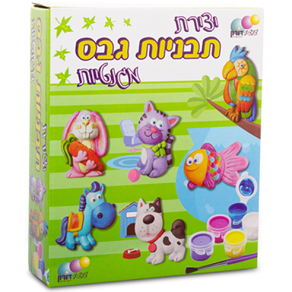 תבנית פלסטיק עם 6 דוגמאות, אבקת גבס, מגנטים, ערכת 6 צבעי גואש, מכחול, דף הוראות בעיברית