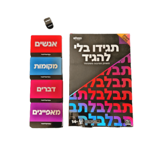 "תגידו בלי להגיד" הוא משחק קופסה משעשע, דינמי ומושלם למסיבות וערבים משפחתיים. כל שחקן מקבל מילת מפתח שצריך לתאר לקבוצה אבל יש מילים שאסור לומר!