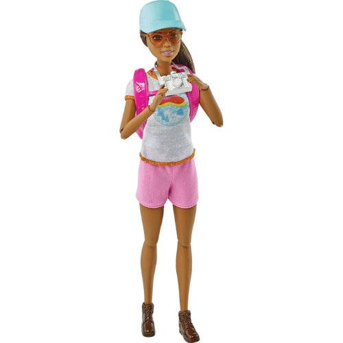 כולל: בובת ברבי, תרמיל, כובע, מצלמה, בקבוק מים, מפת טיול, כלבלב