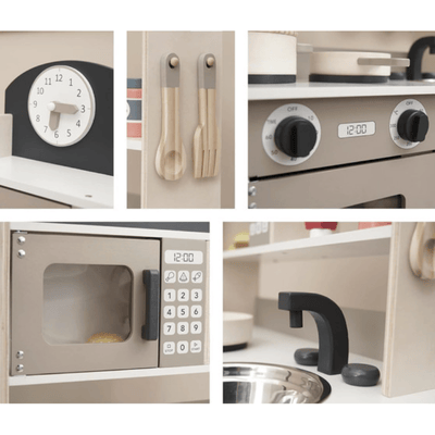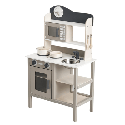 מטבח משחק מעץ איכותי המדמה מטבח אמיתי עם כיריים, תנור, מיקרוגל וכיור נירוסטה. משחק תפקידים מושלם שמעודד דמיון, יצירתיות ועצמאות לילדים מגיל 3 ומעלה.