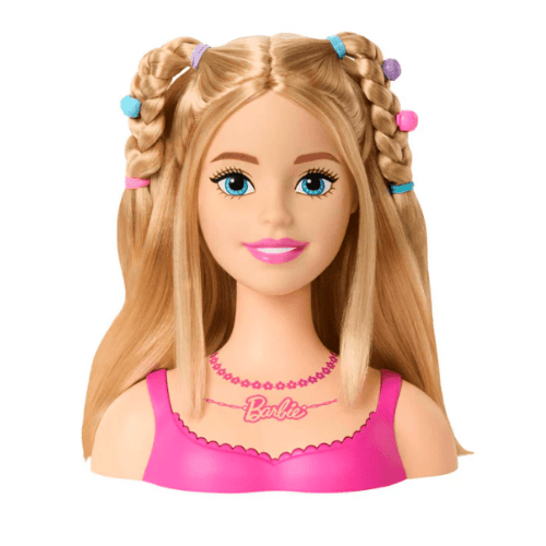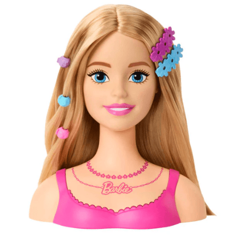 הראש המלא של ברבי כולל שיער בלונד ארוך, רך ונעים לעיצוב, ו 21 חלקים הכוללים מברשת, סיכות, גומיות, קליפסים ועוד.