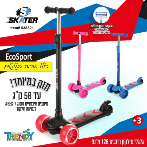 הכירו את קורקינט ECO SPORT קורקינט תלת גלגלי לילדים, עם שלדה חזקה במיוחד, עיצוב צבעוני מרהיב וגלגלים לא מוארים בנסיעה.